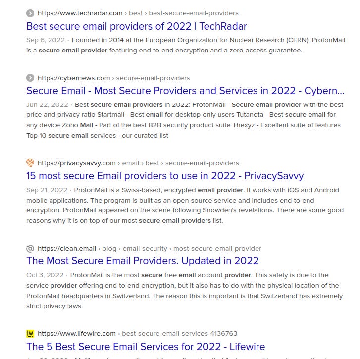 I said that I didn’t think this is particularly related to privacy and security, and I do think that. But in the interests of keeping this semi-actionable, I think this might be part of what keeps people from making even small changes to improving their online privacy. The more options a person is presented with, the more likely they are to stick with what they perceive as the default (often, the existing setup). So, let’s say someone hears about one of the dozens of breaches to happen this month, and decides that they can’t trust companies to secure their data from bad actors, so they want to try to make some small changes. They decide to start with e-mail; Google has had a few big data breaches (although nothing recent that I’m aware of), so they decide to go with a provider that has a better track record; Google’s security is pretty good, but they openly scan basically everything you do for advertising, so it’s only a matter of time. They look up “secure e-mail provider” on DuckDuckGo, and find…